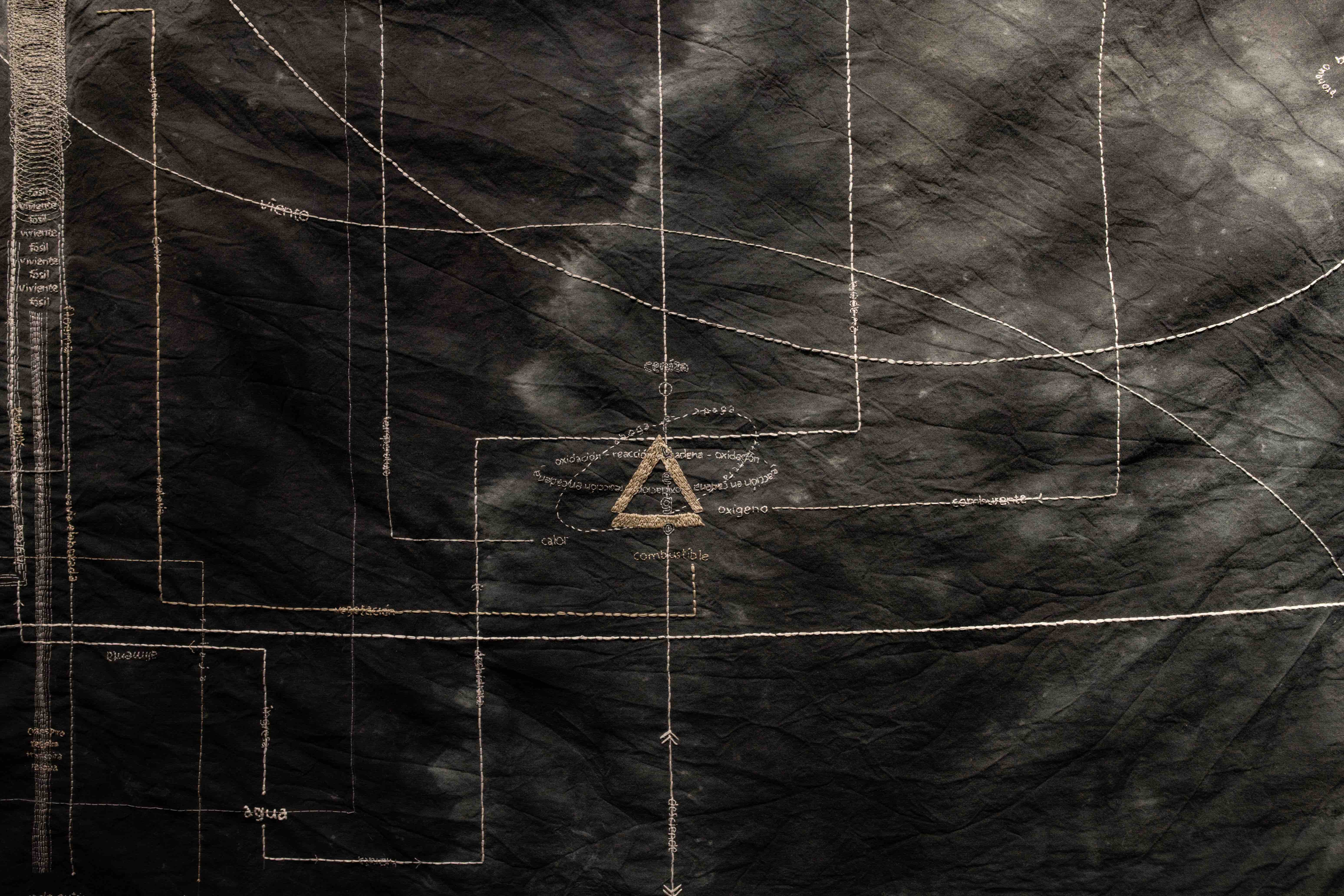 Hebra pendiente II, una de las propuestas de María Jesús Schultz, reflexiona justamente sobre aquello, en torno a la cosmología Shipibo-Konibo, un pueblo asentado a orillas del río Ucayali en la Amazonía peruana, para quienes “la sinuosidad del río evoca a Ronin, también conocida como Yacumama: la gran serpiente cósmica y “madre del agua”, a quien se atribuyen las transformaciones del río y de quien dependen la flora y la fauna. Ronin conecta los planos físico y espiritual, y porta los códigos que estructuran lo existente. Su cuerpo ondulante recorre el universo y condensa, en el entramado de su piel, todos los diseños posibles, como una red invisible que lo atraviesa todo”.